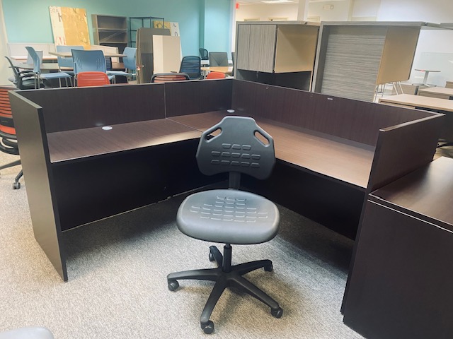 Furniture image Used Black Armless Task Chair & Mahogany Finish L-Shaped Desk New or Used Used Furniture Category: Task chairs